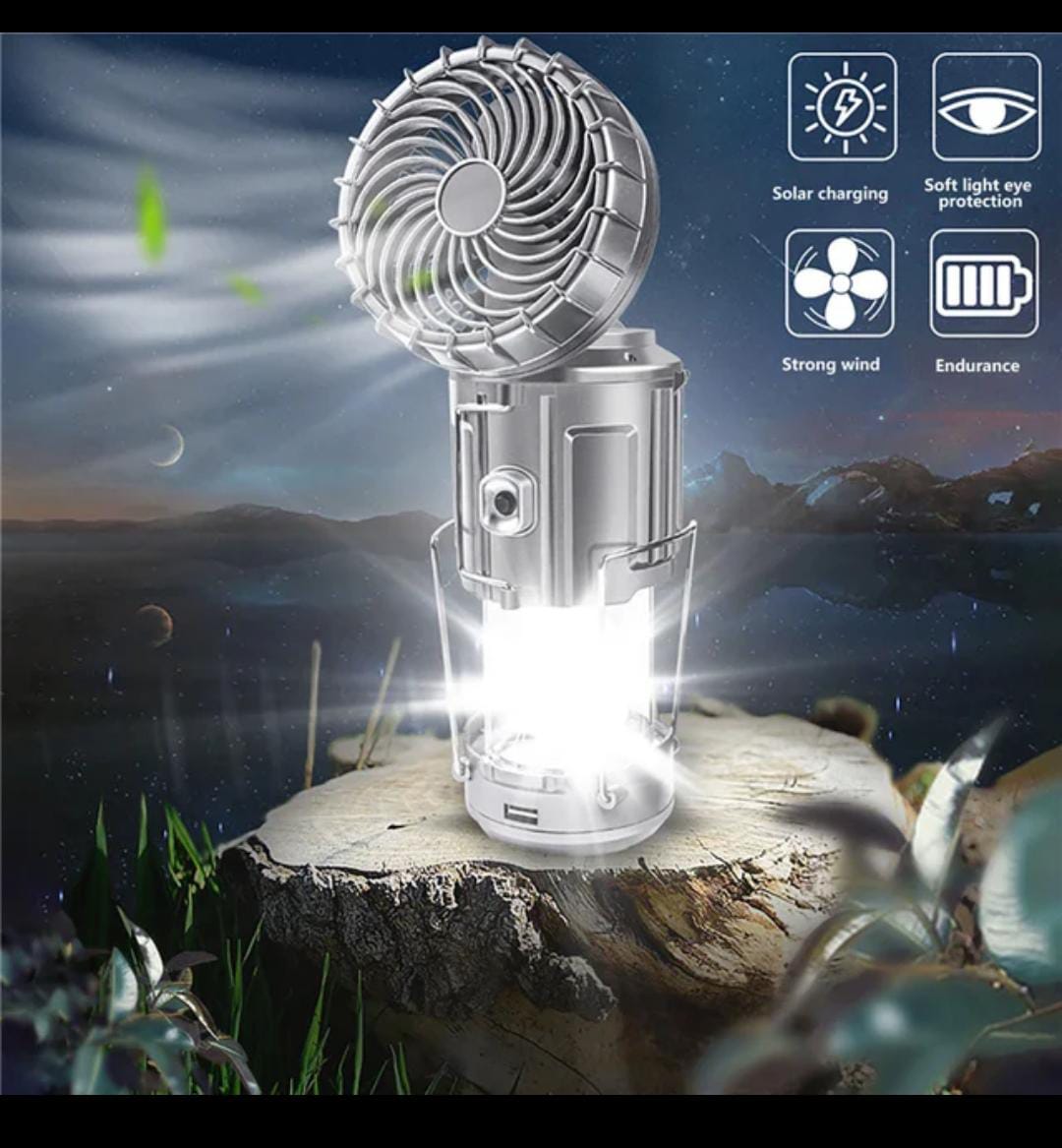 - 6-in-1 Multi-Function Lantern – Combines LED light, fan, tent lamp, flashlight, USB power bank, and more.